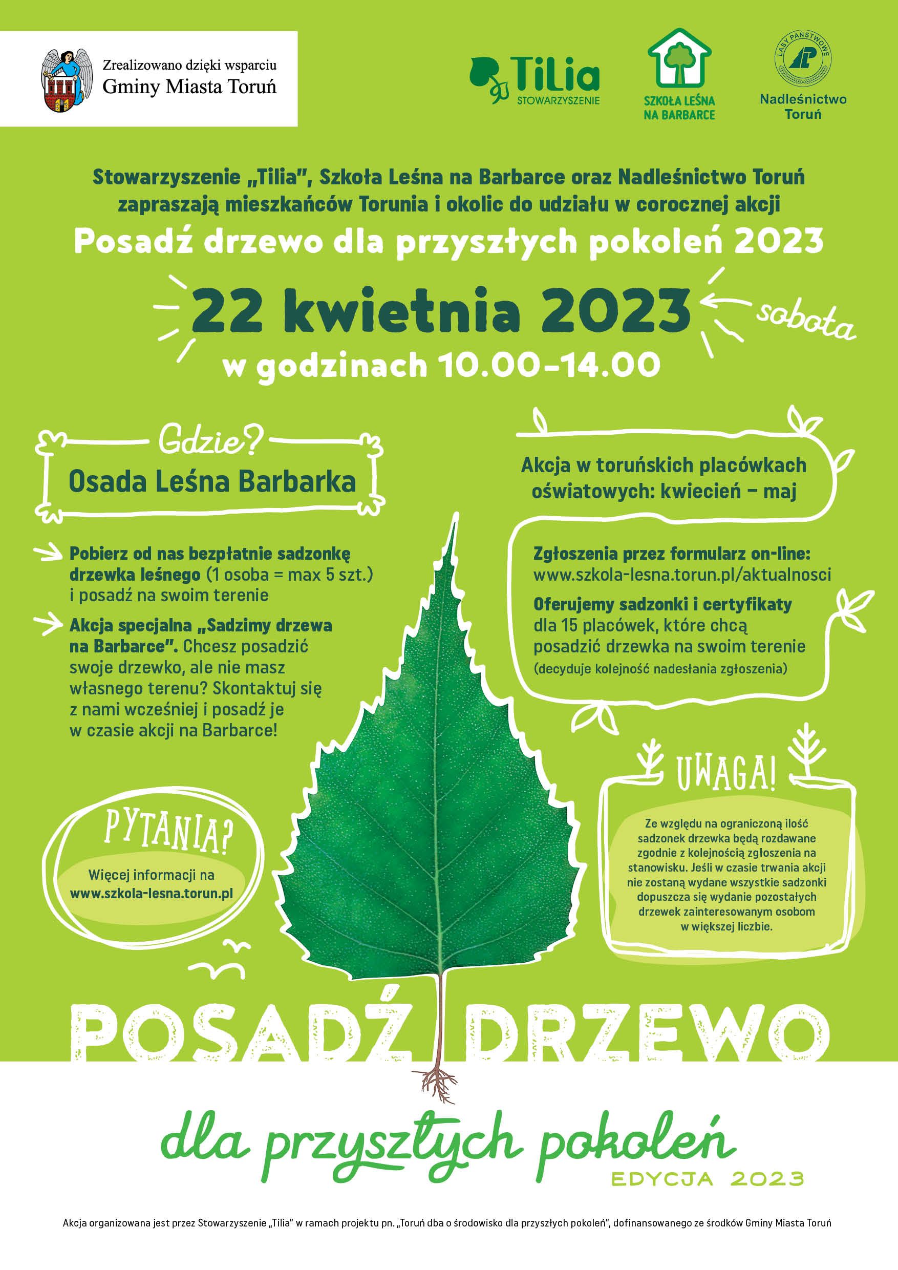 Stowarzyszenie „TILIA”, Szkoła Leśna na Barbarce oraz Nadleśnictwo Toruń zapraszają mieszkańców Torunia i okolic do udziału w corocznej akcji pn. „Posadź drzewo dla przyszłych pokoleń 2023”.