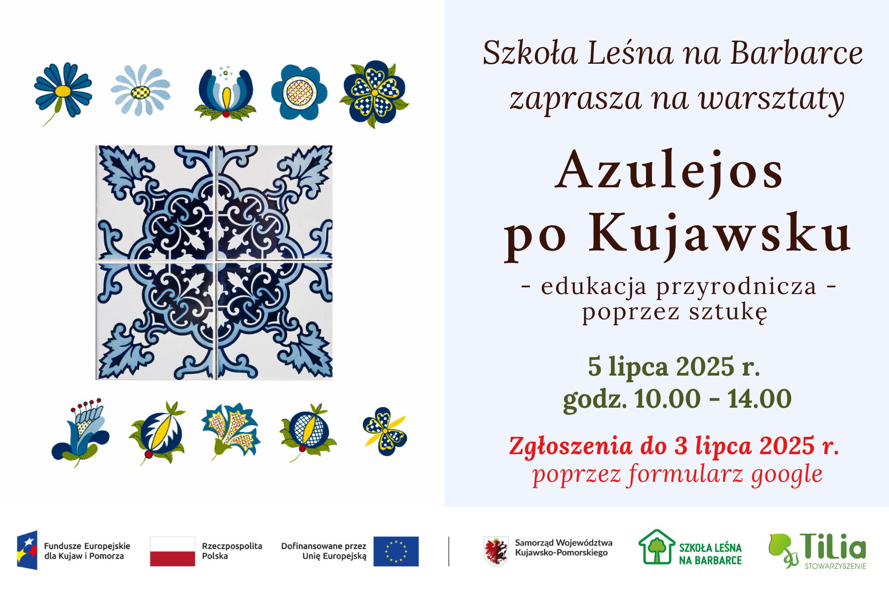 Warsztaty odbywają się w ramach projektu pn."Szkoła Leśna na Barbarce - wsparcie i rozwój działań Ośrodka Edukacji Przyrodniczo - Ekologicznej w regionie Kujawsko - Pomorskim" realizowany jest w ramach programu Fundusze Europejskie dla Kujaw i Pomorza 2021 - 2027 przez Stowarzyszenie Tilia.