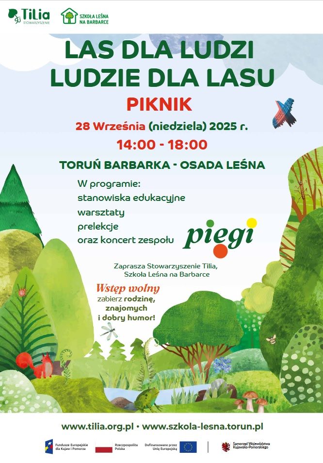 Wydarzenie organizowane jest w ramach projektu pn."Szkoła Leśna na Barbarce - wsparcie i rozwój działań Ośrodka Edukacji Przyrodniczo - Ekologicznej w regionie Kujawsko - Pomorskim" , który realizowany jest w ramach programu Fundusze Europejskie dla Kujaw i Pomorza 2021 - 2027 przez Stowarzyszenie Tilia.