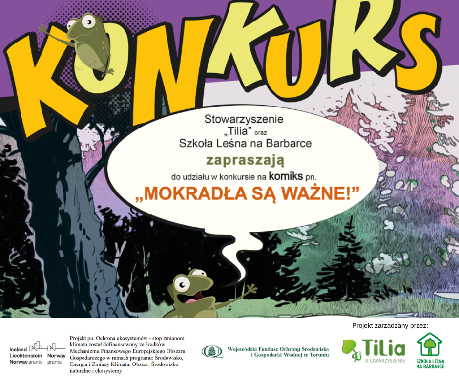 Stowarzyszenie “Tilia” serdecznie zaprasza nauczycieli z województwa kujawsko – pomorskiego, warmińsko-mazurskiego i wielkopolskiego wraz z uczniami do wzięcia udziału w konkursie na komiks pn.”Mokradła są ważne!”.