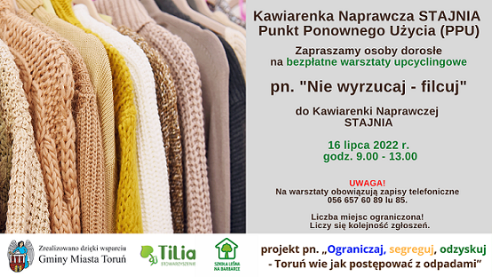 Serdecznie zapraszamy mieszkańców Torunia na kolejne z cyklu bezpłatnych warsztatów upcyclingowych odbywających się w Kawiarence Naprawczej Stajnia w ramach projektu „Ograniczaj, segreguj, odzyskuj - Toruń wie jak postępować z odpadami”, który realizowany jest dzięki wsparciu Gminy Miasta Toruń.Warsz...