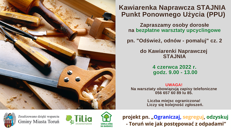 Stowarzyszenie „Tilia” oraz Szkoła Leśna na Barbarce zaprasza mieszkańców Torunia na drugie z cyklu bezpłatnych warsztatów upcyclingowych odbywających się w Kawiarence Naprawczej Stajnia w ramach projektu pn. „Ograniczaj, segreguj, odzyskuj - Toruń wie jak postępować z odpadami” .